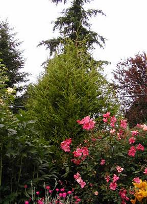 x Cupressocyparis l. 'Castlewellan' & Rosa 'mutabilis'